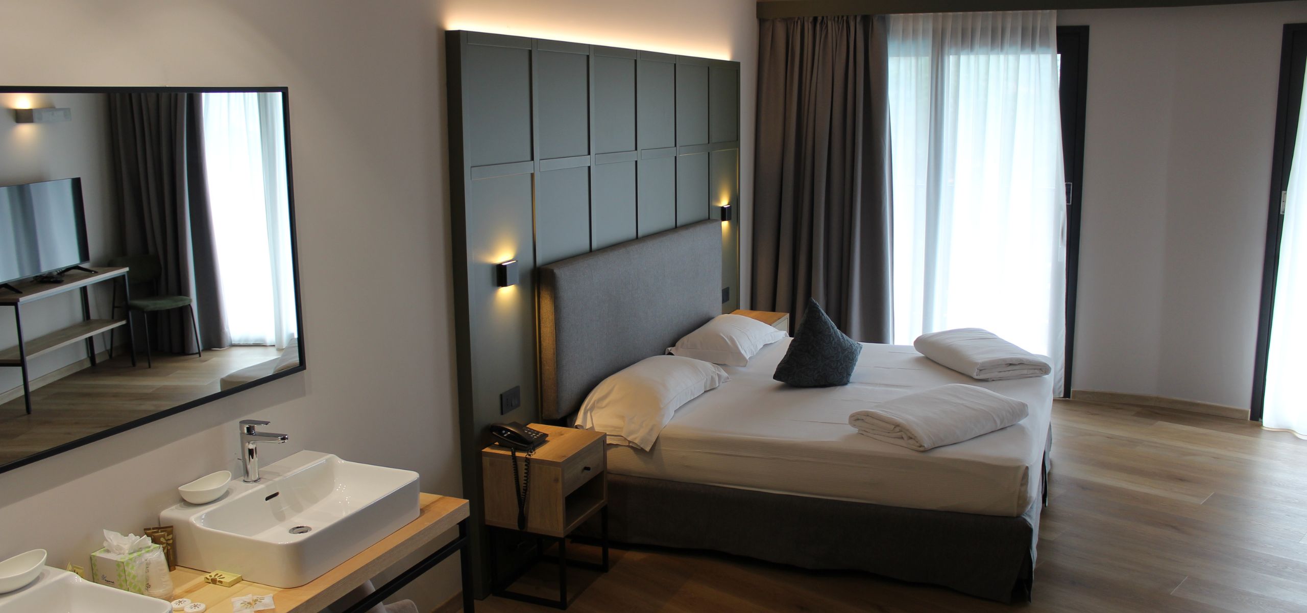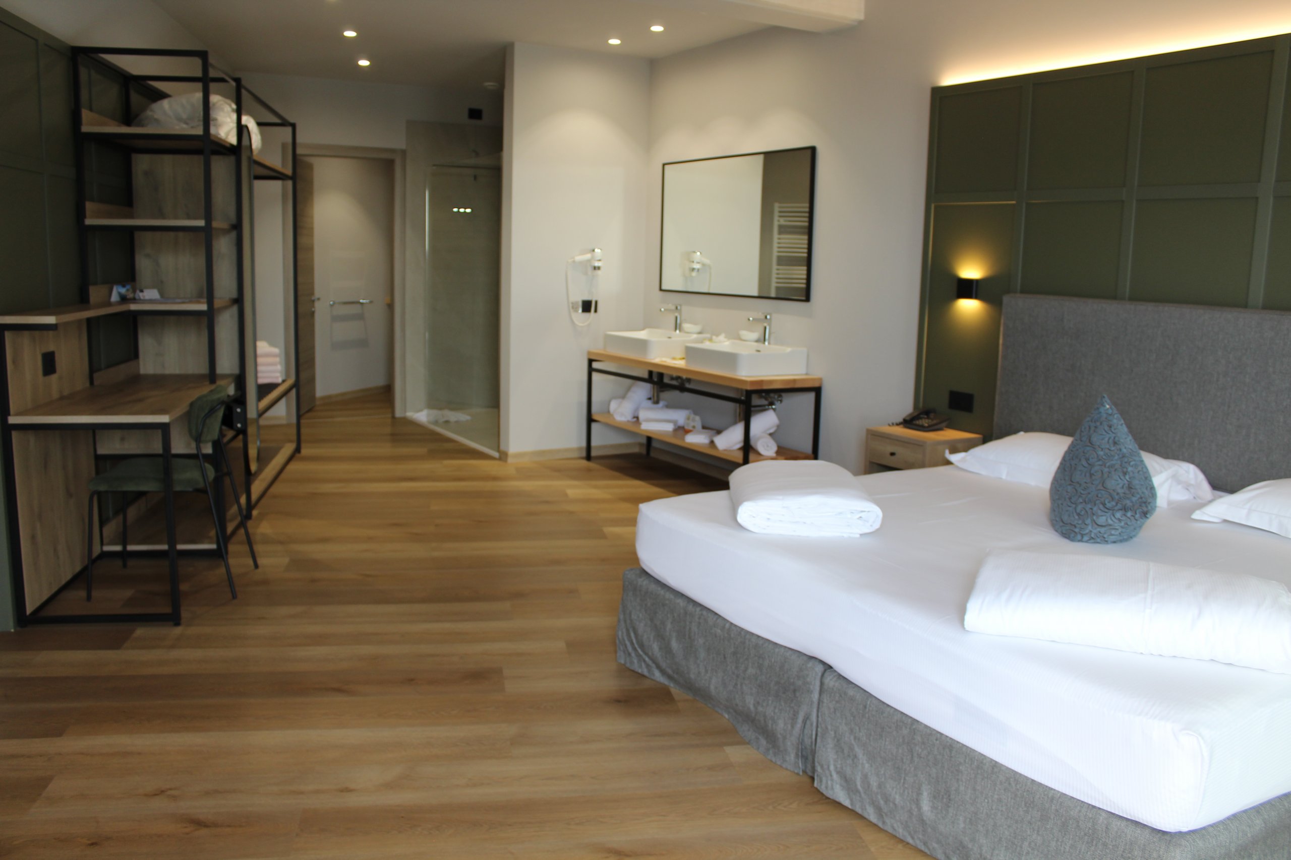 Embrace the magnificent panorama from the balcony of our splendid Penthouse Suite, located on the roof top of the main building. Perfect accommodation for large families and with its air pool an ideal oasis of peace and relaxation for those seeking tranquillity and plenty of space (up to 5 people – 1st room with double/twin bed, 2nd room with a single and a bunkbed – one extra cot possible)